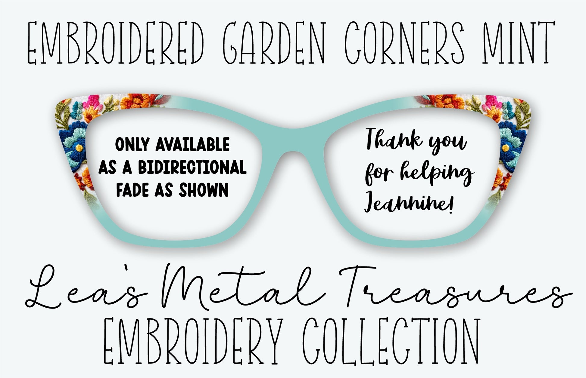 EMBROIDERED GARDEN CORNERS MINT Eyewear Frame Toppers • Fundraiser for Jeannine